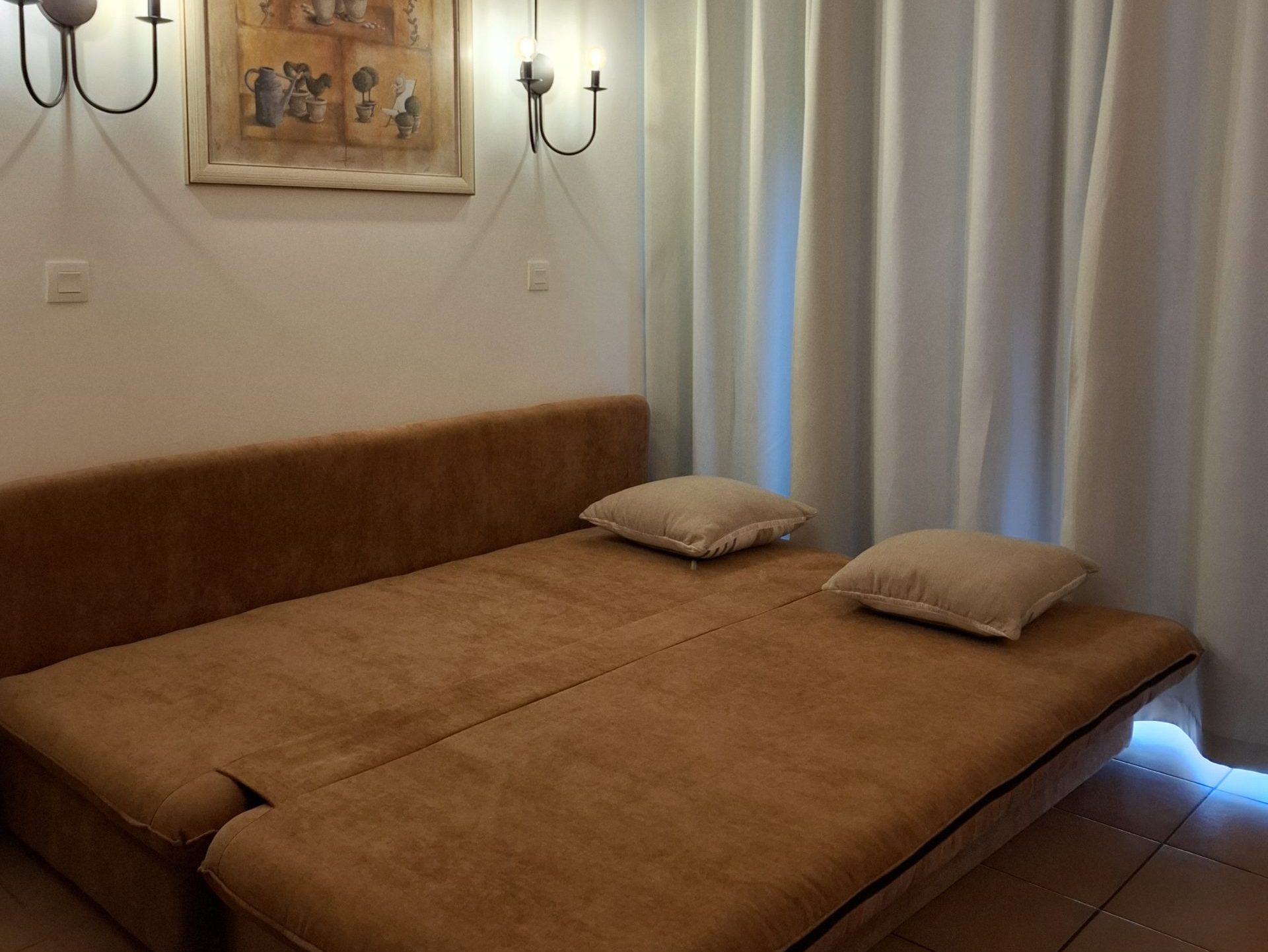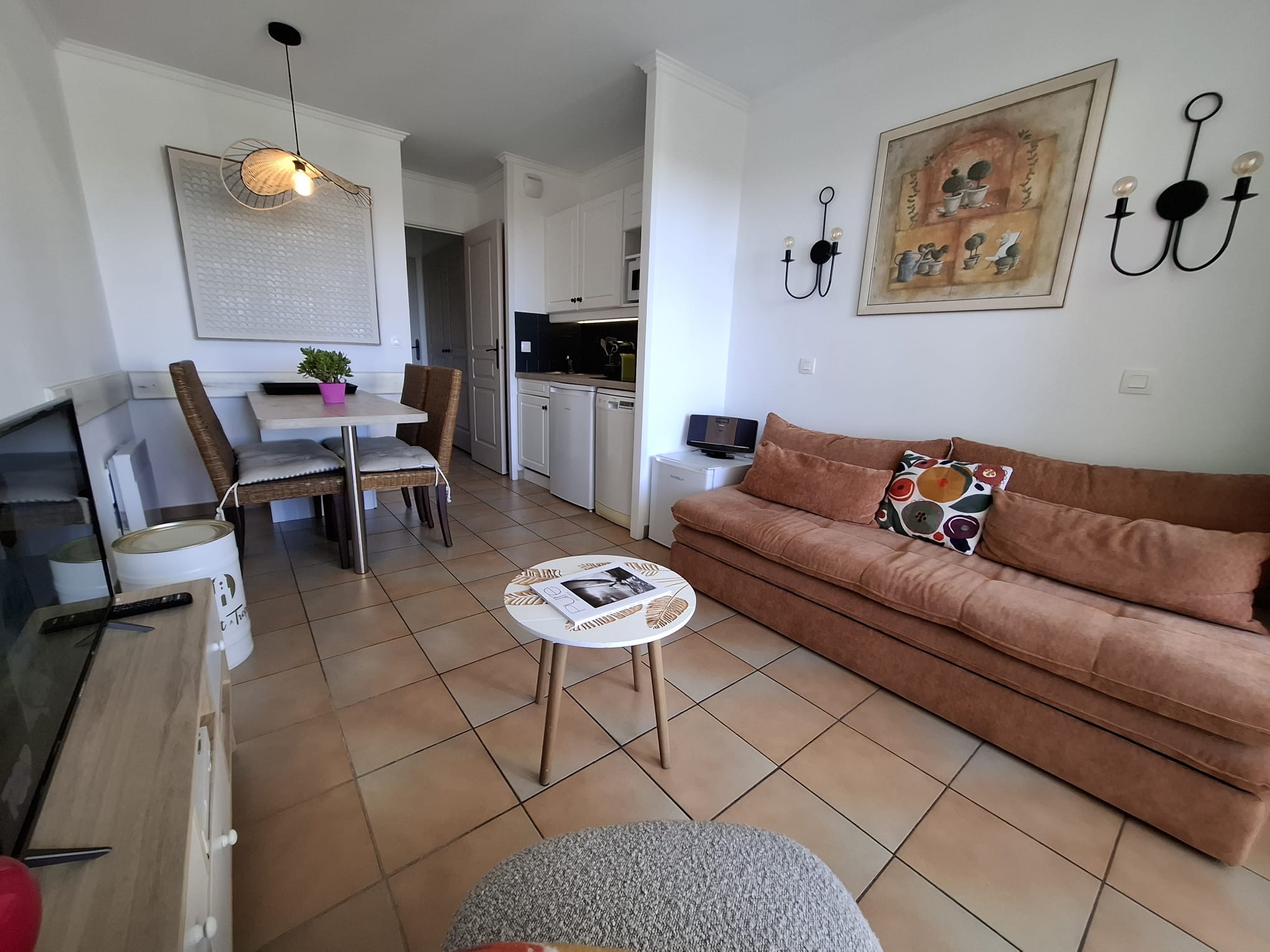 Découvrez un séjour lumineux avec une table et des chaises, une télévision, ainsi qu’un canapé-lit pour vos moments de détente.