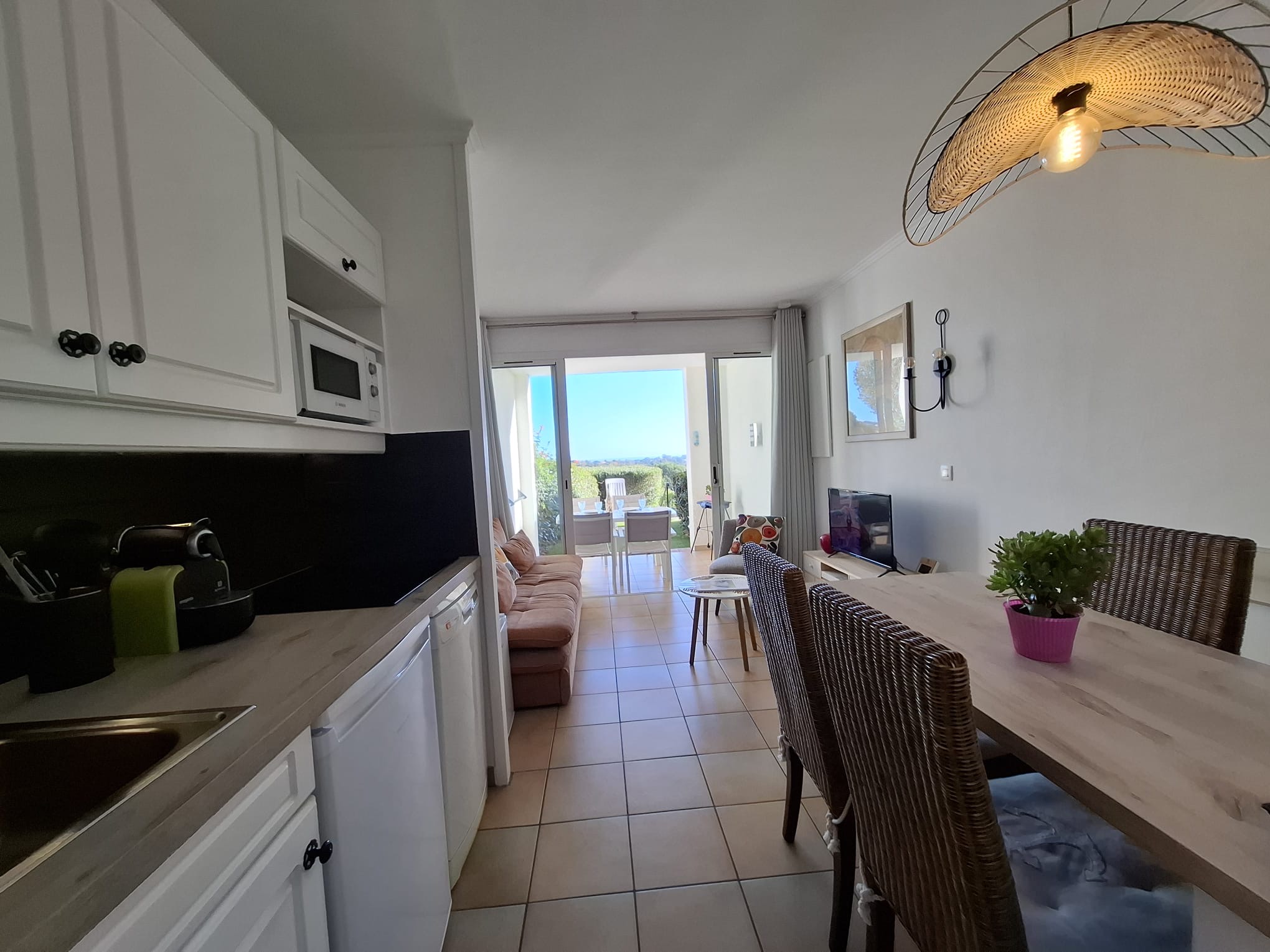 La kitchenette est entièrement équipée avec une cafetière, une bouilloire, un grille-pain, un four micro-ondes, un lave-vaisselle, une plancha, et tout le nécessaire de cuisine pour préparer de délicieux repas.
